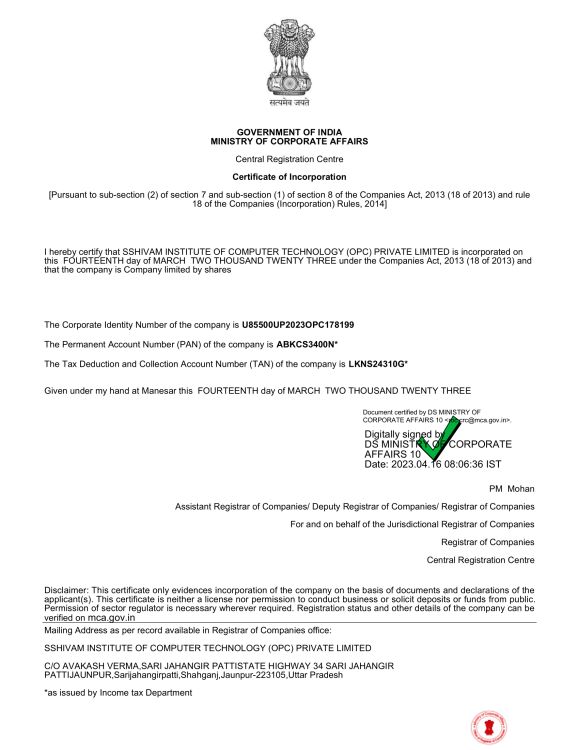 An ISO 9001 : 2015 Certified India's Largest Computer Educational Organization Established Under Ministry of Corporate Affairs, Govt. of India, Corporate Identity No.U85500UP2023OPC178199